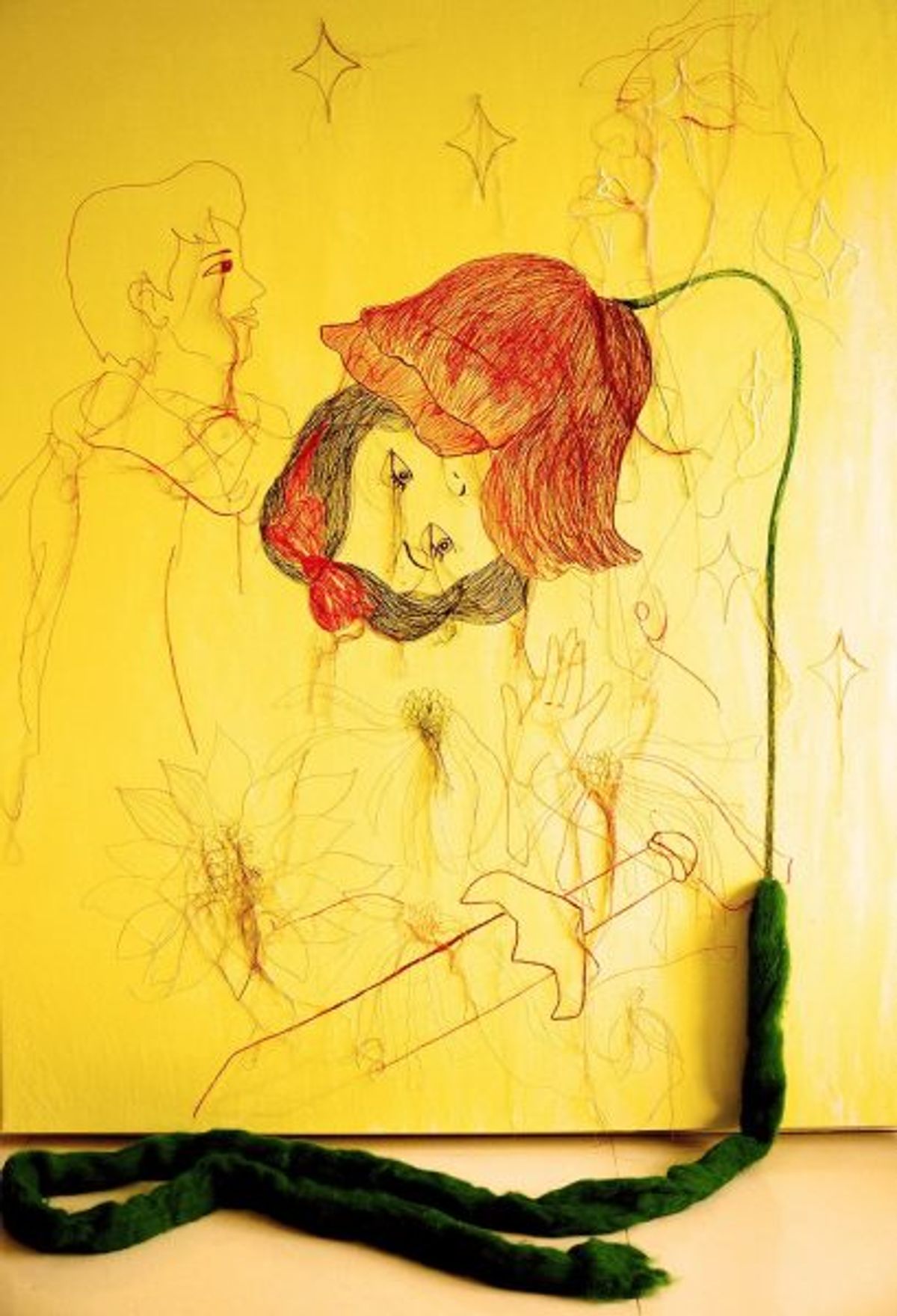 Taiwanese artist Chang En-Tzu works with embroidery techniques to play with and subvert the Disney princess fairy tales that little girls everywhere have been raised on and which continue to shape their hopes and desires as adults. The choice of Snow White plays up the ideal of the pure, virginal woman waiting passively to be rescued by her Prince Charming, while the unravelling threads point to the limits where these imposed stories end and where the individual starts spinning her own fate.