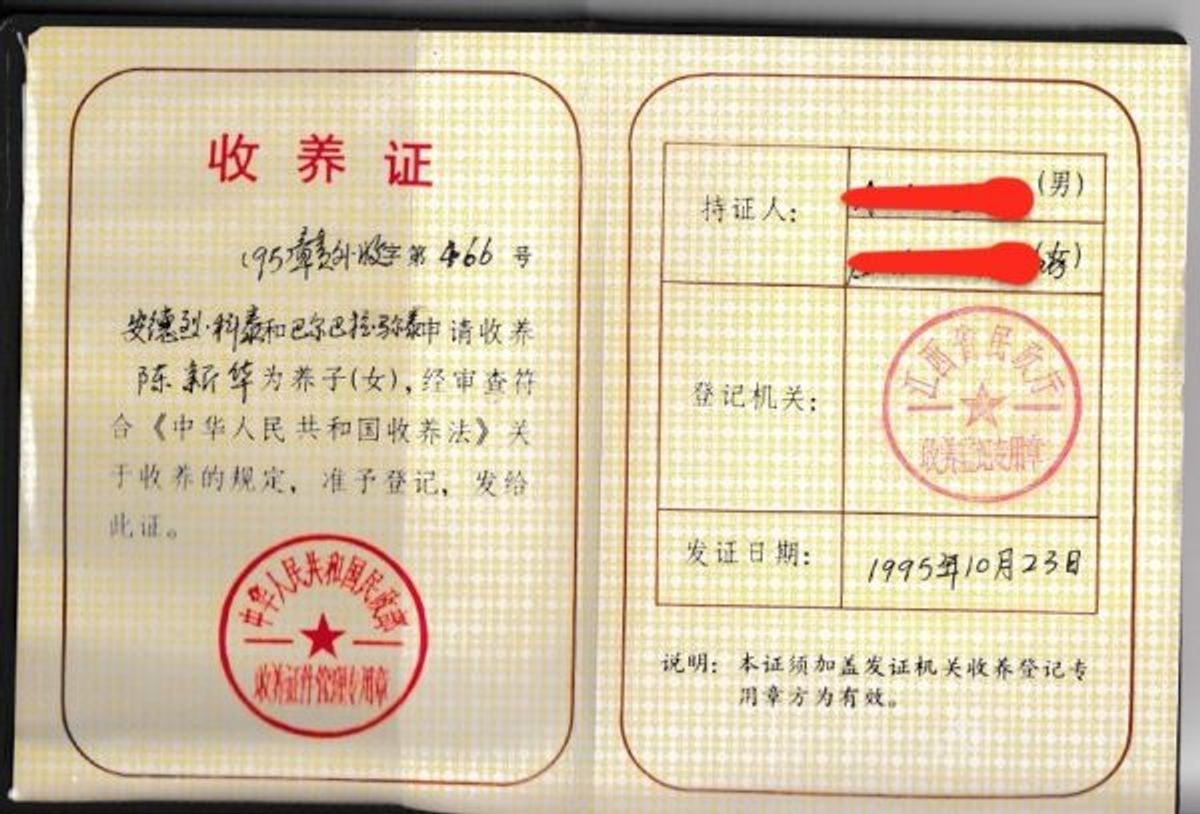 Certificate of adoption in former Chinese passport, 1995. Credit: André-Anne Côté.[/caption]