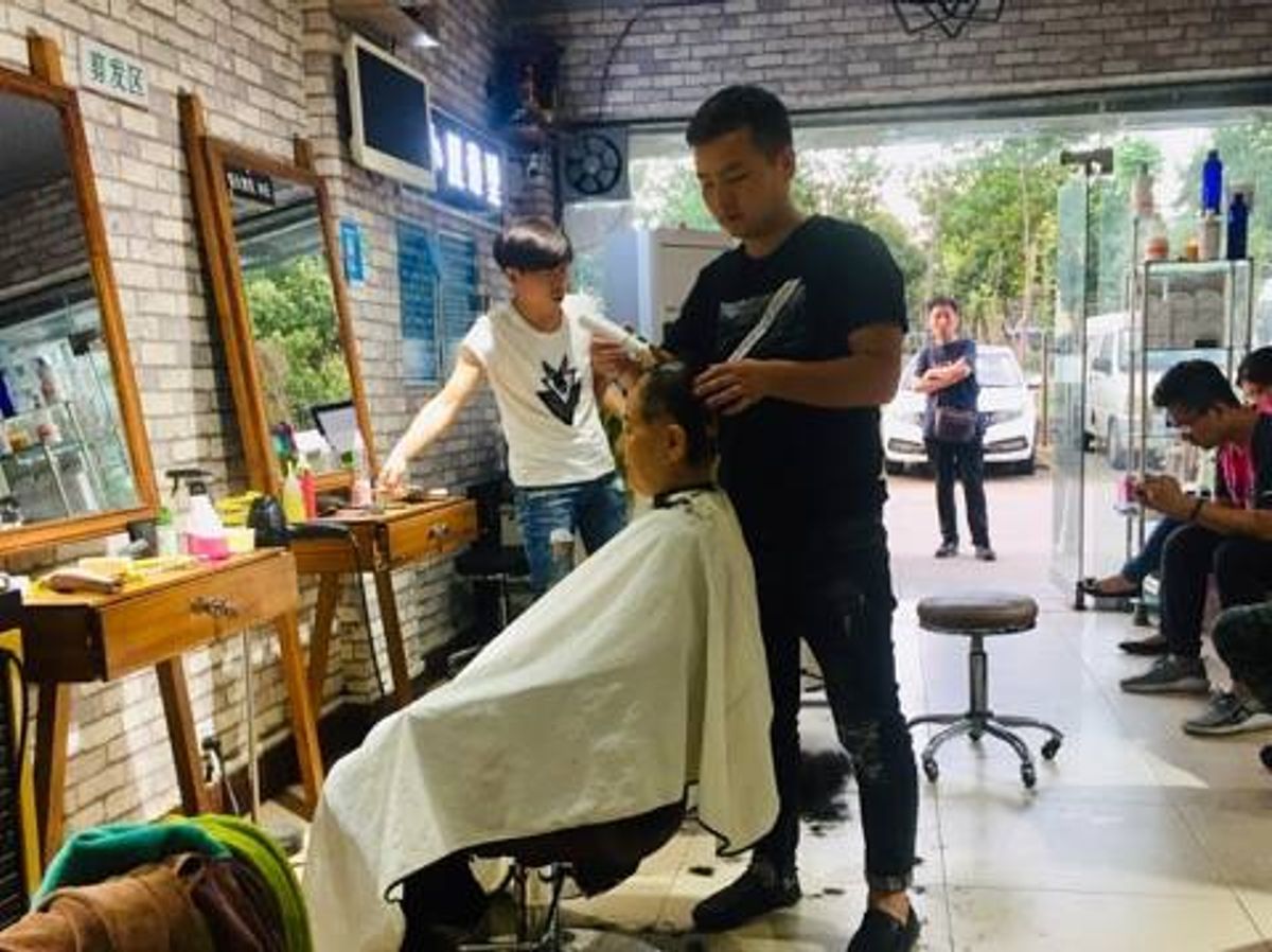 A hairdresser in Wang's neighbourhood shaves her mother's head. Credit: Wang Zhen.[/caption]